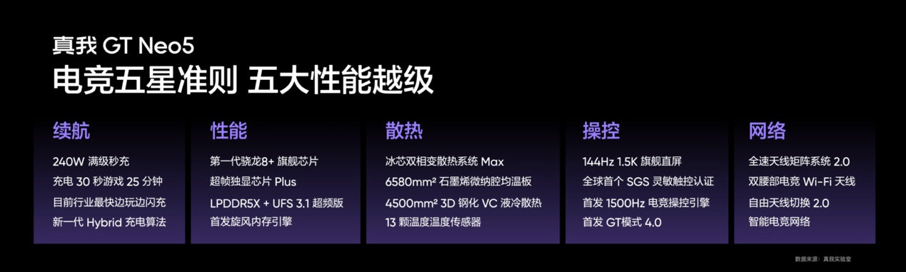三是联合泰尔实验室打造行业首个电竞五星准则。针对续航、性能、散热、操控、网络五大电竞体验维度,电竞五星准则建立了科学的评价算法和标准。真我GT Neo5针对这五大维度,进行全面升级和优化,带来GT Neo系列有史以来最大幅度的性能越级。
