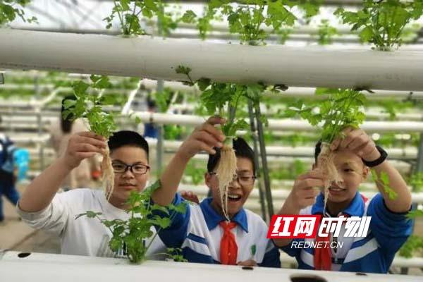 在射埠镇中心小学,学校在荒坡上开垦的劳动实践基地成为今天孩子们心中的“幸福湾”。1500余平米的基地规整地为每个班级划出“责任田”。孩子们种植五彩稻(盆载)、辣椒、花生、玉米、桃、李等,绿化树木多达64种。学校不定期邀请镇农技站技术人员和种田能手带领孩子们一块劳动。“在这里我们养成了劳动习惯、学习了劳动技能和农业知识,还能分享劳动成果,收获满满、幸福满满。”六年级学生欧阳语涵说。